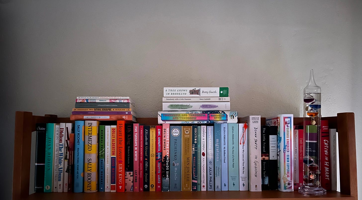 The top shelf holds books from my favorite female authors because I want my daughter to grow up knowing she can be at the top.